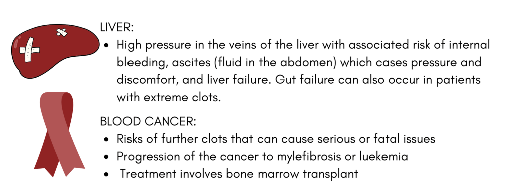Blood clots formed in vital organs, due to a progressive blood cancer